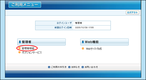 管理者機能ページが表示されます。