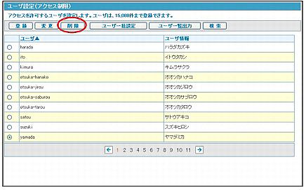step1 ユーザ設定(アクセス制限)画面を表示し、削除するユーザを選択して「削除」ボタンをクリックします。
