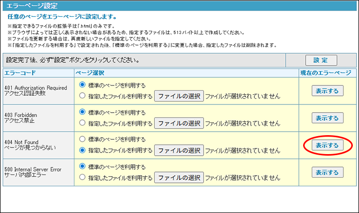 step1 エラーページ設定画面で、確認するエラーページの「表示する」ボタンをクリックします。