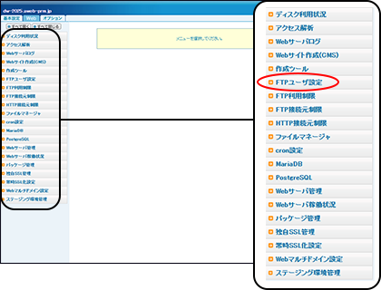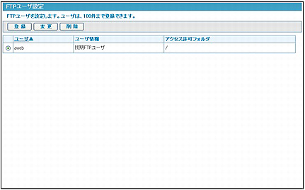 Web画面を表示し、「FTPユーザ設定」をクリックします。
