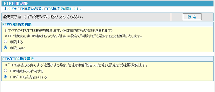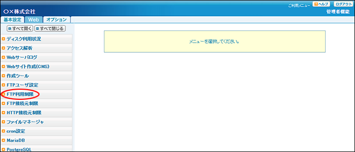 Web画面を表示し、「FTP利用制限」をクリックします。