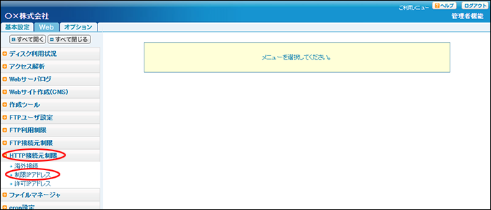 step1 Web画面を表示し、「HTTP接続元制限」→「制限IPアドレス」の順にクリックします。