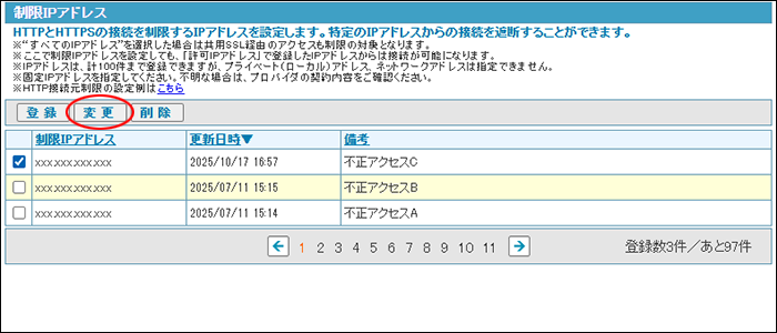 step2 変更する制限IPアドレスを選択し、「変更」ボタンをクリックします。