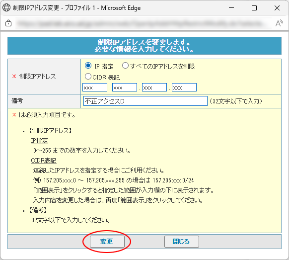 特定のIPアドレスを指定するときは「IP指定」、連続したIPアドレスを指定するときは「CIDR表記」を選択し、IPアドレスを入力します。 すべてのIPアドレスを制限するときは「すべてのIPアドレスを制限」を選択します。 |