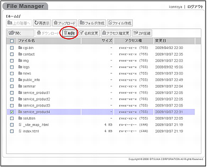 step1 ファイルリスト画面を表示し、削除するファイルを選択して「削除」ボタンをクリックします。
