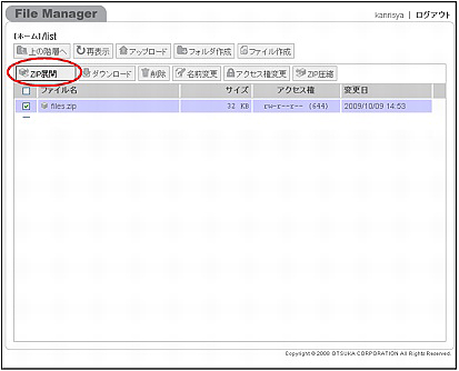 ZIP形式で圧縮されたファイルを、ファイルマネージャ上で展開します。