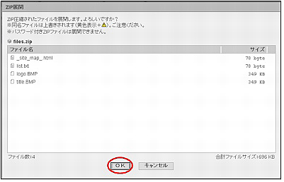 アイコンが表示されます。ZIP展開できませんので、「キャンセル」ボタンをクリックし、ファイルリスト画面に戻ってください。