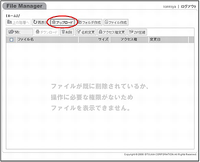 step1 ファイルリスト画面を表示し、ファイルをアップロードするディレクトリを表示して「アップロード」ボタンをクリックします。