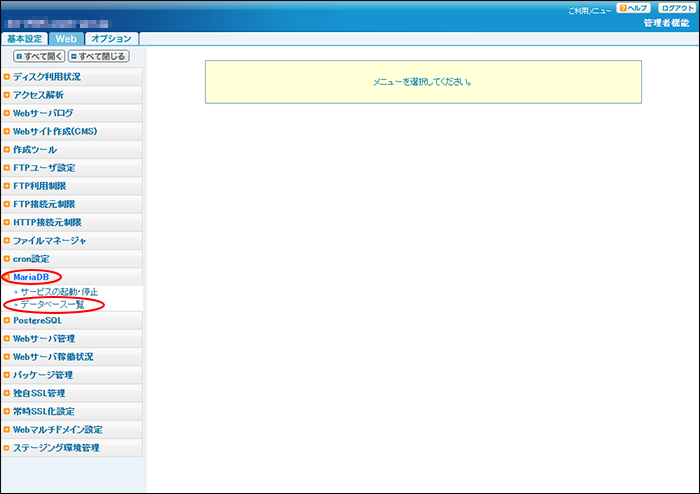 ※PostgreSQLのデータベース一覧画面を表示する場合は、Web画面で「PostgreSQL」→「データベース一覧」の順にクリックしてください。
