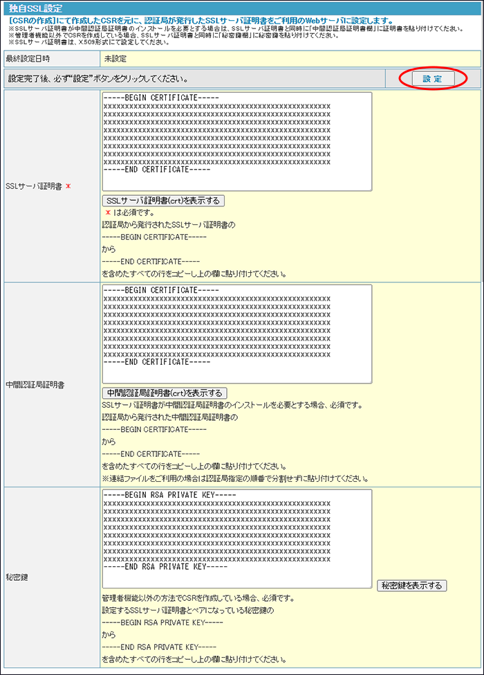 | 秘密鍵 | 各認証会社から発行されたサーバ証明書とペアになっている秘密鍵の -----BEGIN RSA PRIVATE KEY-----から-----END RSA PRIVATE KEY----- を含めたすべての行をコピーして貼り付けます。 ※「「CSR(証明書署名要求)を作成する」でCSRを作成した場合、この項目は入力しません。 |