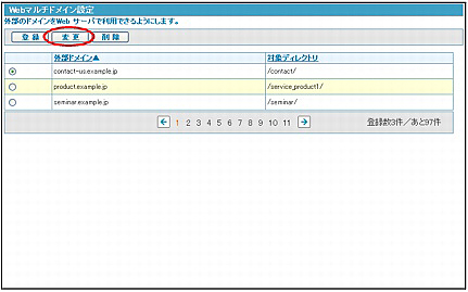 step1 Webマルチドメイン設定画面を表示し、登録内容を変更する外部ドメインを選択して「変更」ボタンをクリックします。