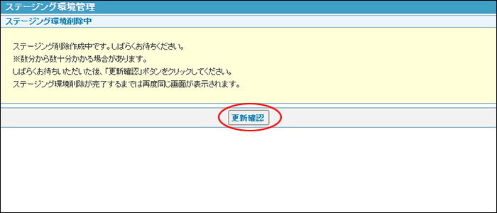 「設定」ボタンをクリック後、ステージング環境の削除処理が完了するまでは同じ画面が表示されています。「更新確認」ボタンをクリックしても、画面は遷移しません。