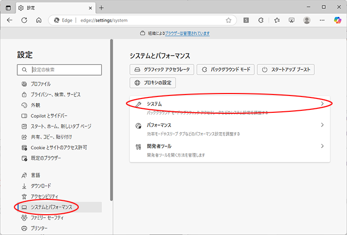 「システムとパフォーマンス」→「システム」をクリックします。