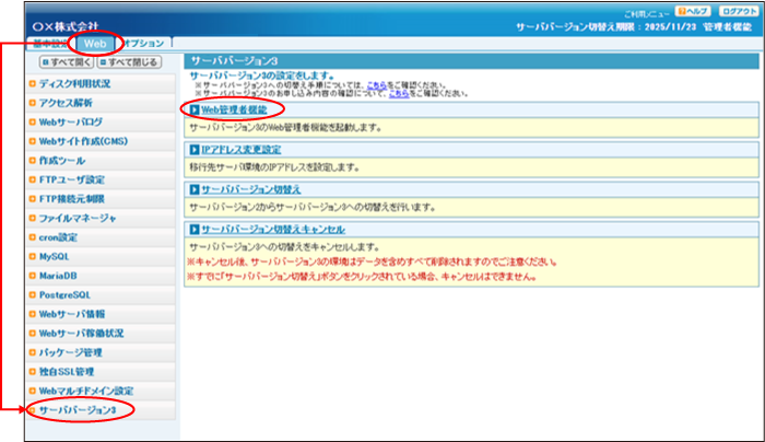 Web画面を表示し、「サーババージョン3」→「Web管理者機能」をクリックします。