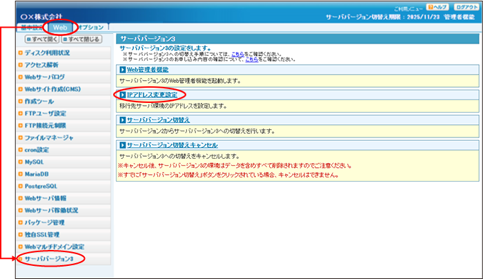 Web画面を表示し、「サーババージョン3」→「IPアドレス変更設定」をクリックします。