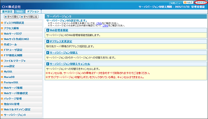 - ホームページやデータベースのデータを移行する選択をされた場合でも、必ず移行されたデータをご確認ください。移行されていないデータがあった場合は、お客様にてサーババージョン2からデータの移行をお願いします。