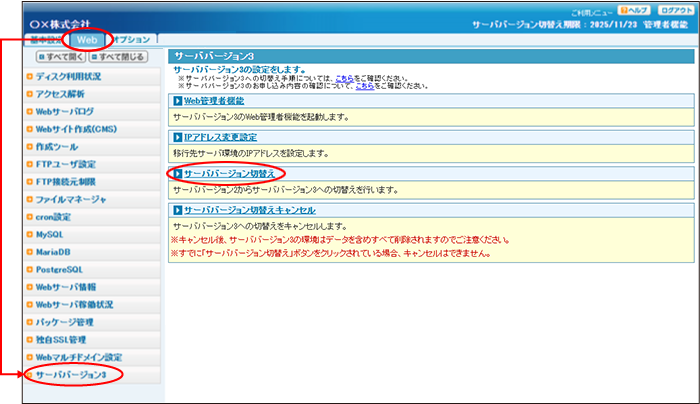step1 Web画面を表示し、「サーババージョン3」→「サーババージョン切替え」をクリックします。