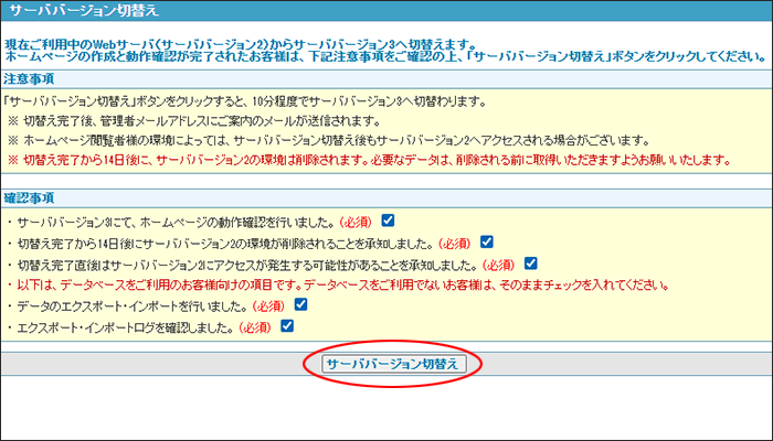 次に確認事項を確認し、すべてのチェックボックスにチェックを入れ「サーババージョン切替え」ボタンをクリックします。