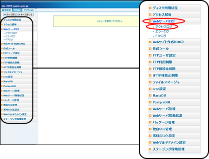 step1 Web画面を表示し、「Webサーバログ」→「アクセスログ」の順にクリックします。