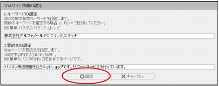 SEO対策キーワード・要約文は、ロボット型検索サイトなどで参照される重要な情報となります。ホームページ上には表示されませんが、SEO対策として入力されることをお勧めします。