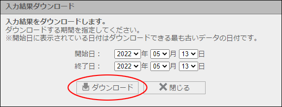 | 開始日 | ダウンロードする期間の開始日を設定します。 ※開始日には、ダウンロードできる最も古い日付が自動で表示されます。 |