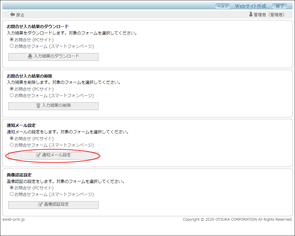 step1 お問合せフォームの管理画面を表示し、「通知メール設定」ボタンをクリックします。