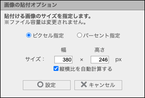 「サイズ指定貼付」をクリックすると、画像の貼付オプション画面が表示されます。必要事項を入力し「貼付」ボタンをクリックすると、指定したサイズで画像を貼り付けることができます。