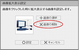 設定を解除する画像を選択し、アイコンをクリックします。表示された画像拡大表示設定画面で、「画像の解除」ボタンをクリックします。