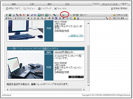step1 ページ編集画面を表示し、リンクに設定する文字列やボタンを選択してアイコンをクリックします。