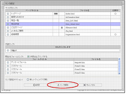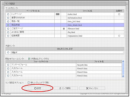 リンク設定オプション リンク先を新しいウィンドウで表示する場合、「新しいウィンドウで開く」を選択します。