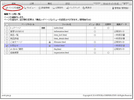 step1 編集ページの一覧画面を表示し、編集するお問合せフォームを選択して「ページの編集」をクリックします。