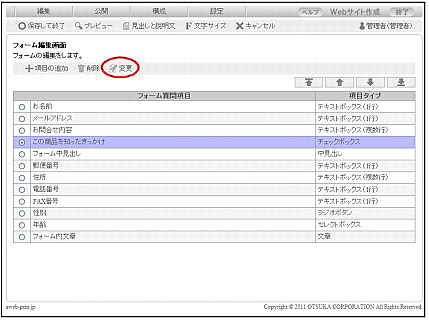 step1 フォーム編集画面を表示し、内容を変更する項目を選択して「変更」をクリックします。