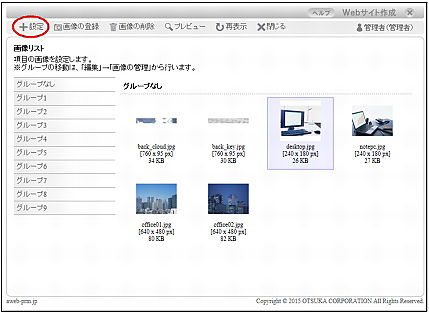 ・「画像の登録」をクリックすると、画像の登録画面で画像を1ファイルずつ登録できます。登録時は、「グループなし」に登録されます。