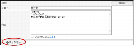 「会社概要」、「商品情報、サービス内容など、画像付きの項目」は、必要に応じて、0個~5個まで設定することが可能です。詳しくは、「項目を追加する」をご覧ください。