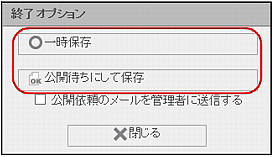 | 公開待ちにして保存 | ページを「公開待ち」の状態にして保存します。「公開待ち」状態にしたページは、管理者によって公開の許可/非許可の判断が行われます。 ※「公開依頼のメールを管理者に送信する」を選択して、クリックすると、「postmaster@ドメインサービスのご契約ドメイン名」のメールアドレスに公開依頼のメールが送られます。 |
