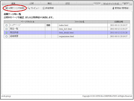 step1 公開ページの一覧画面を表示し、公開領域から削除するページを選択して「公開ページの削除」をクリックします。