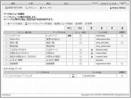 | ファイル名 | ページのファイル名が表示されます。共用SSLで公開されているページには、 ※トップページに設定されているページは、ファイル名を変更できません。 |