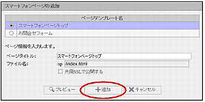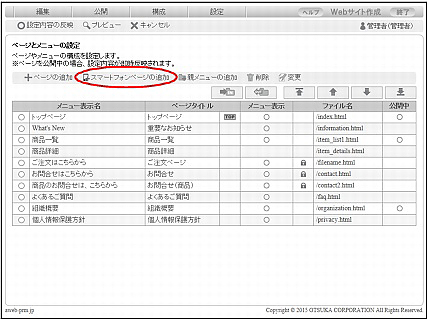 step1 ページとメニューの設定画面を表示し、「スマートフォンページの追加」をクリックします。