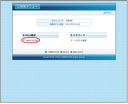 ご利用メニューを表示し、「Webサイト作成」をクリックします。