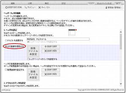 step1 ヘッダ・フッタの編集画面を表示し、ヘッダもしくはフッタの「ロゴ画像を使用する」を選択します。
