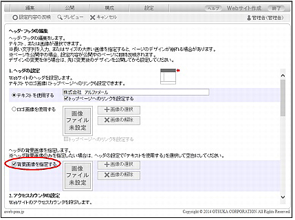 step1 ヘッダ・フッタの編集画面を表示し、「背景画像を指定する」を選択します。