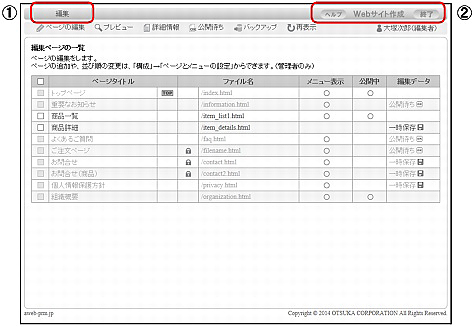 編集ページの一覧 ページの内容を編集します。また、バックアップデータの作成や、SEO対策キーワード、RSS記事の設定を行います。 「編集ページの一覧画面を表示する」「編集中ページのバックアップ操作を行う」