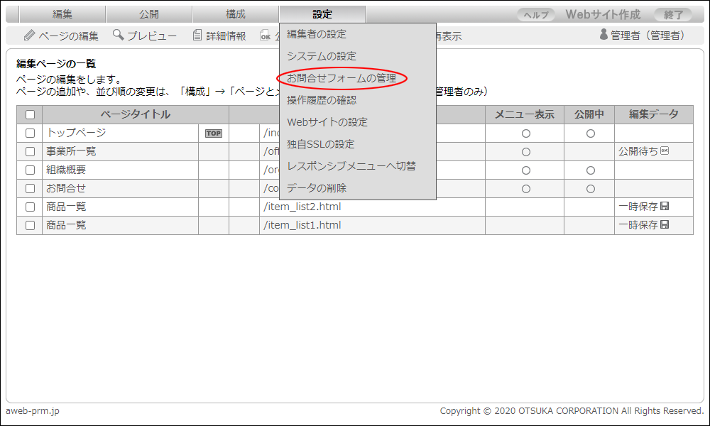 step1 Webサイト作成画面を表示し、「設定」→「お問合せフォームの管理」の順にクリックします。
