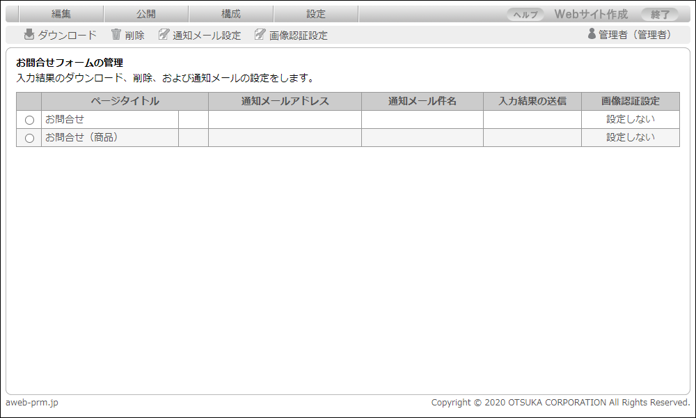 Webサイト作成で作成したお問合せフォームを管理します。フォームから送られてきた内容のダウンロード・削除や通知メールの設定を行います。