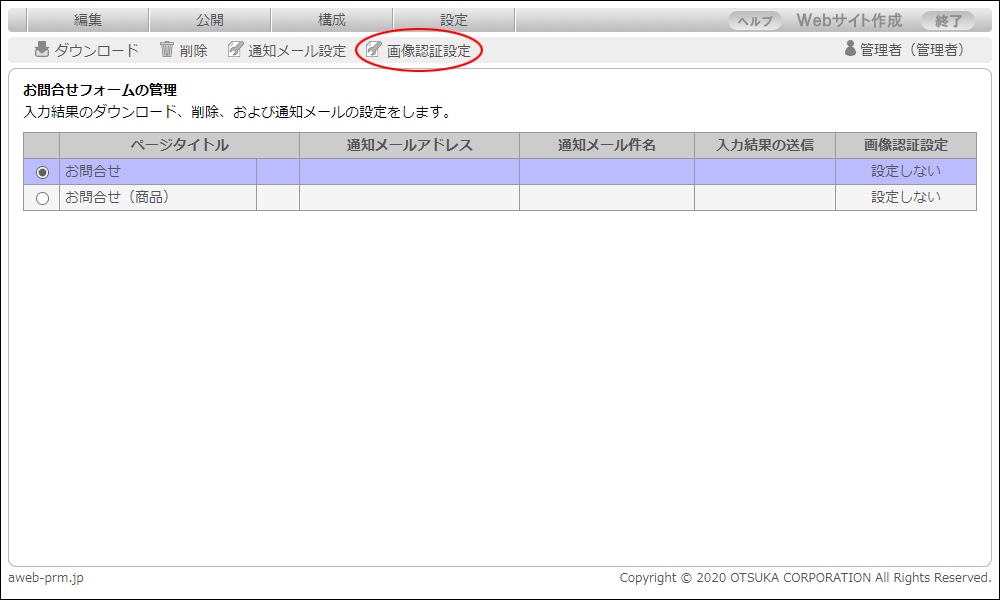 step1 お問合せフォームの管理画面を表示し、設定するフォームを選択して「画像認証設定」をクリックします。