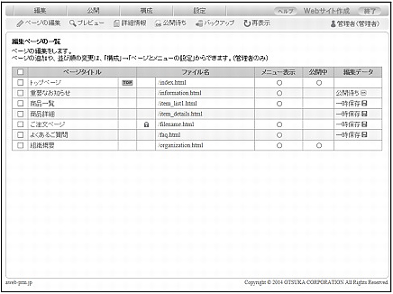 ウイザード形式でのWebサイトの作成が完了している場合、Webサイト作成機能にログインすると、編集ページの一覧画面が初期設定で表示されます。