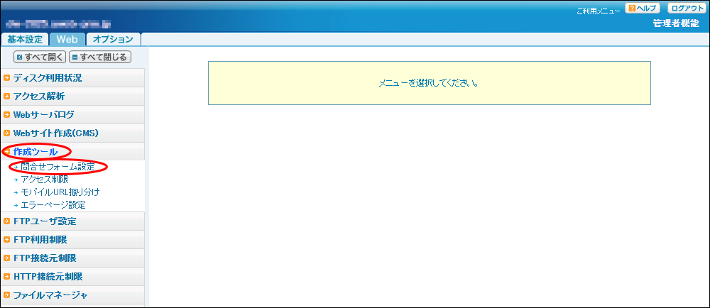 Web画面を表示し、「作成ツール」→「問合せフォーム設定」の順にクリックします。