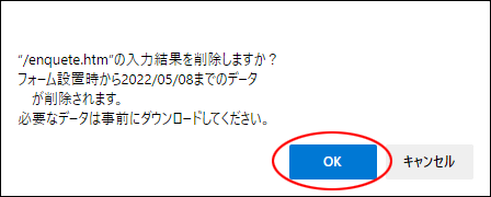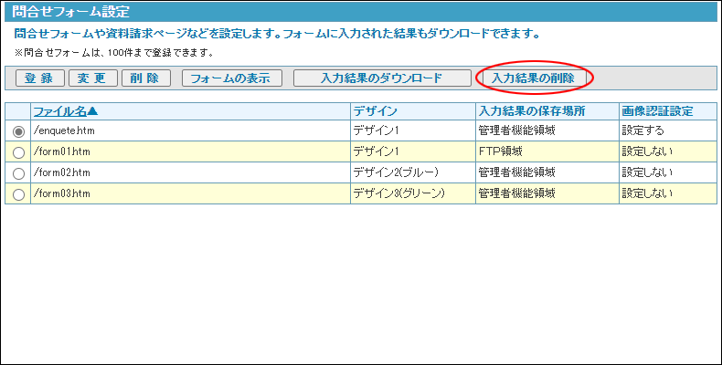 問合せフォームを設置する際、入力結果の保存場所を「FTPでダウンロードできる領域に保存する」と設定した場合は、削除できません。
