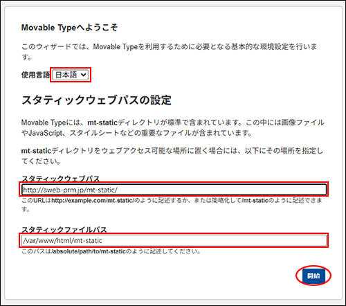 | スタティックファイルパス | 「/var/www/html/mt-static」を入力 |