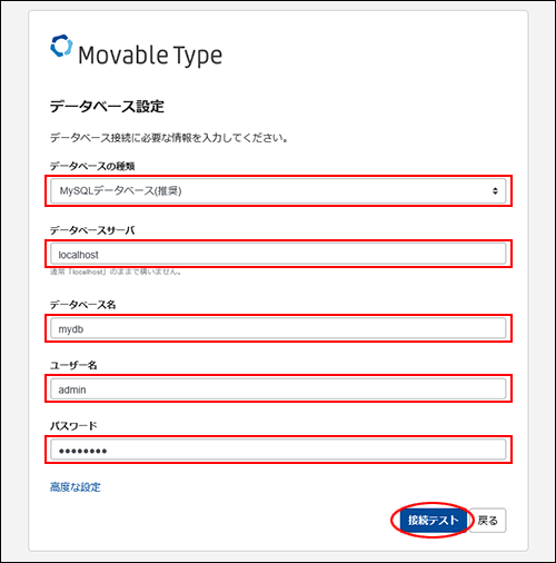 必要事項を入力し、「接続テスト」をクリックします。